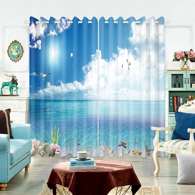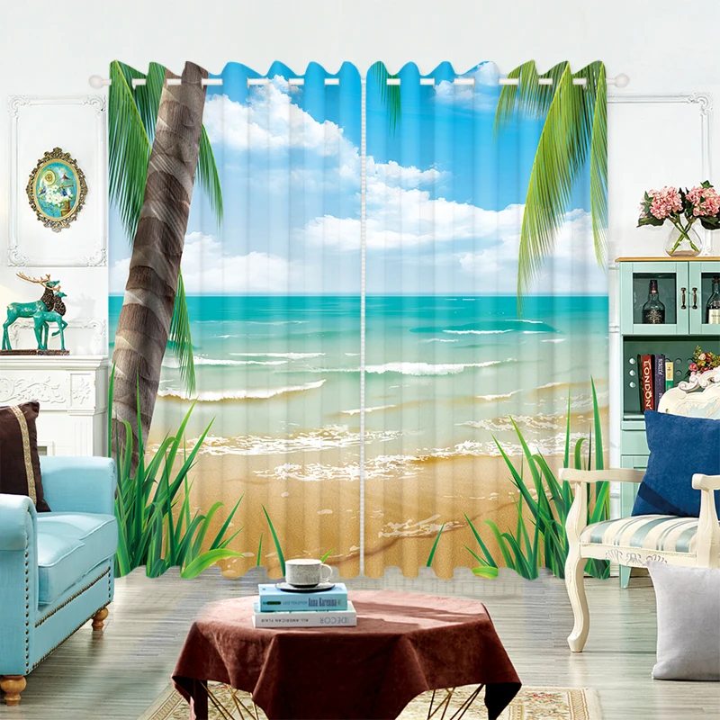 BEST SELLER Customizable Bedroom Blackout Curtain Beach Coconut Grove Seascape Pattern Velvet Fabric Tulle Curt